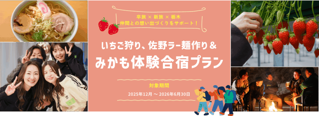 仲間との時間をしっかり楽しめる「いちご狩り、佐野ラー麺作り&みかも体験合宿プラン」を期間限定でご用意しました。“仲間と自然の中で過ごす追いコン&新歓”という記憶に残る体験をつくりませんか?