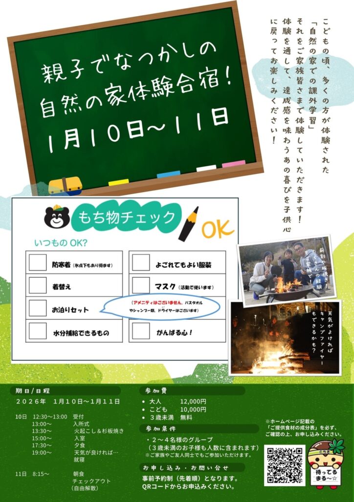 News お知らせ 2025.1201 お知らせ 親子でなつかしの自然の家体験合宿! ※参加条件は「2~4名様のグループ」と記載しておりますが、調整可能な場合に限り、5~6名様のグループもご案内できる場合がございます。お手数ですが、詳細につきましてはお電話にてご相談ください。 ■お申し込み イベントのお申込みはこちら 朝食の成分表はこちら 夕食の成分表はこちら マシュマロの成分表はこちら News一覧へ